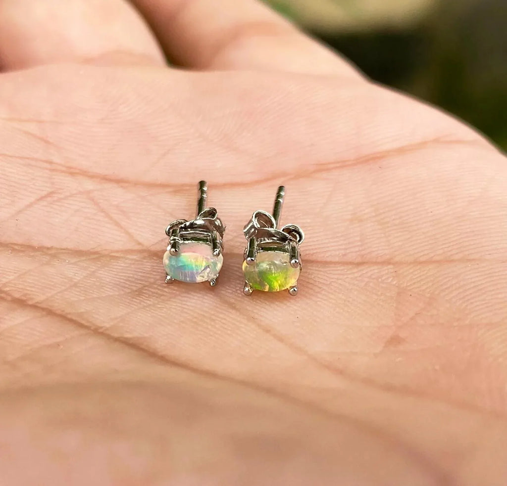 Sourced directly from Ethiopia, these genuine opals are celebrated as the October birthstone, symbolizing hope, creativity, and joy. The minimalist design, paired with a secure prong setting and comfortable push back closure, makes them ideal for everyday wear or special occasions.