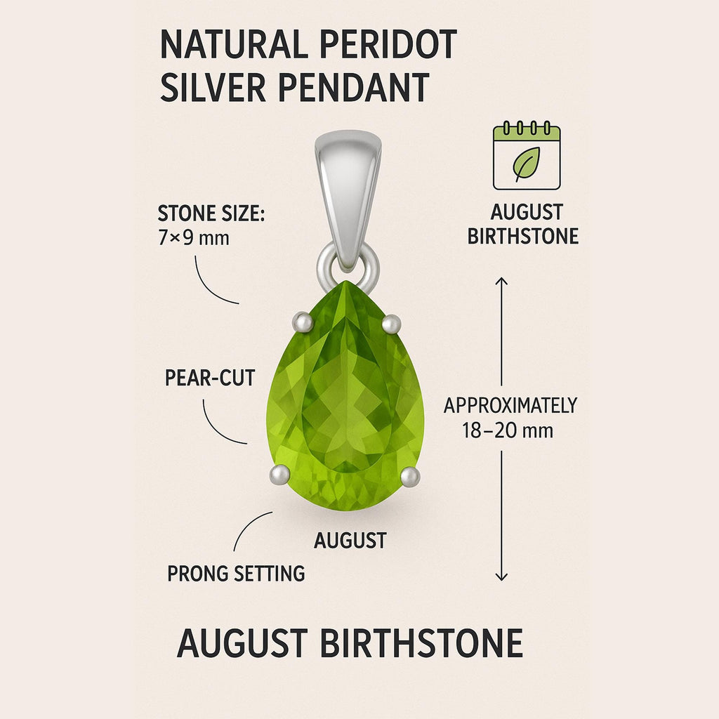 Celebrate vibrant color and timeless style with this Natural Peridot Pendant, beautifully handcrafted in 925 Sterling Silver. The pendant showcases a fresh green 7×9 mm pear-cut faceted Peridot, renowned for its bright, uplifting energy.