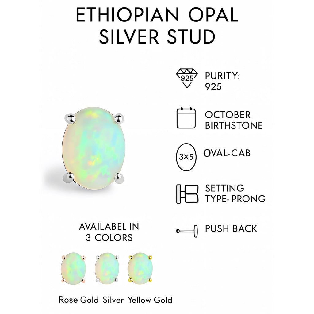 Sourced directly from Ethiopia, these genuine opals are celebrated as the October birthstone, symbolizing hope, creativity, and joy. The minimalist design, paired with a secure prong setting and comfortable push back closure, makes them ideal for everyday wear or special occasions.