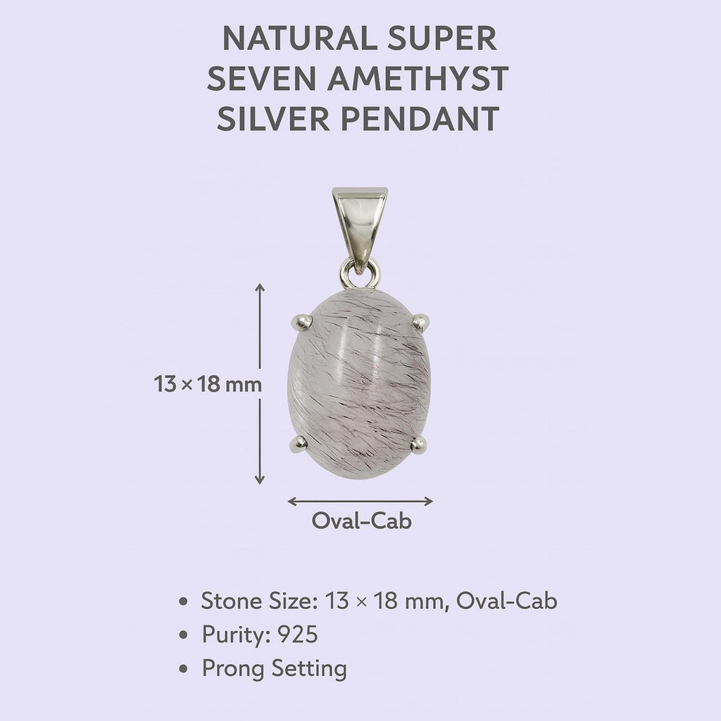 The rare beauty of this Natural Super Seven Amethyst Pendant, expertly crafted in 925 Sterling Silver. Showcasing an impressive 13×18 mm oval cabochon, this unique gemstone combines the energies of seven minerals in one captivating piece—Amethyst, Cacoxenite, Goethite, Lepidocrocite, Clear Quartz, Rutile, and Smoky Quartz—making it a true collector’s treasure.